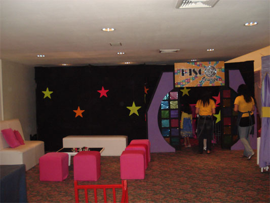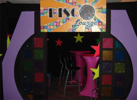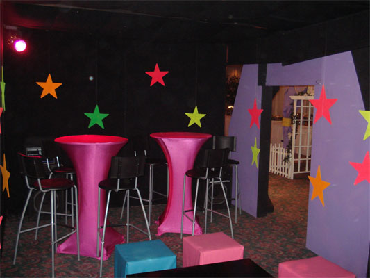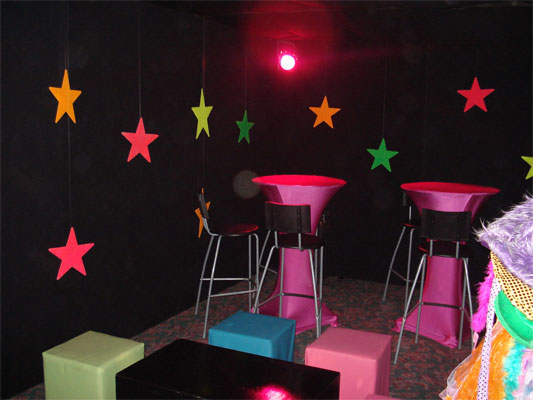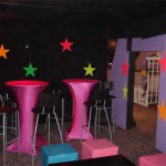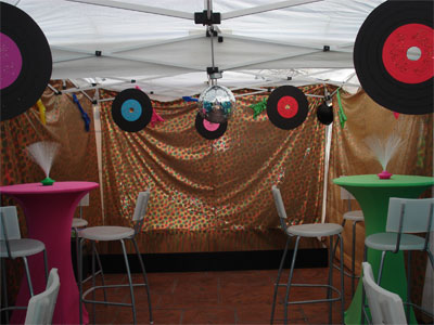 We provide the entire decor, along with hanging records, tables, stage, music and karaoke machine.